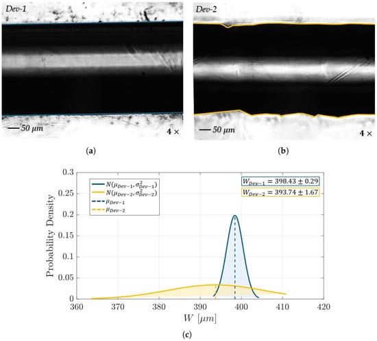 Grayscale frame of the microfluidic channels overlaid with the extracted microchannel profile (magnification: ): (a) Dev-1 and (b) Dev-2. (c) Superimposition of the distribution of 50 measurements of the microchannel widths ( [μm]), with a normal distribution curve interpolated for the data for Dev-1 (blue curve) and Dev-2 (yellow curve).