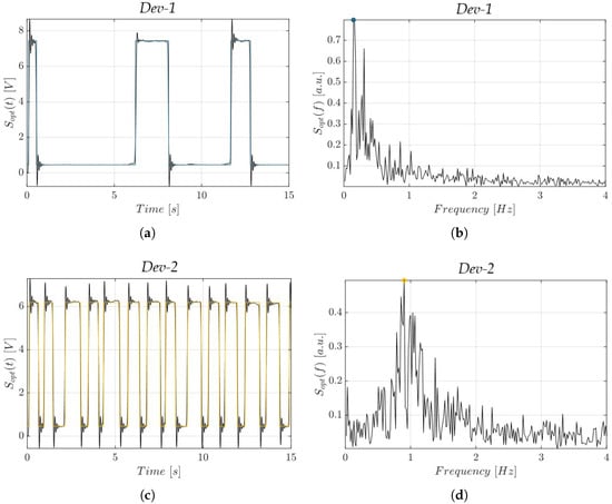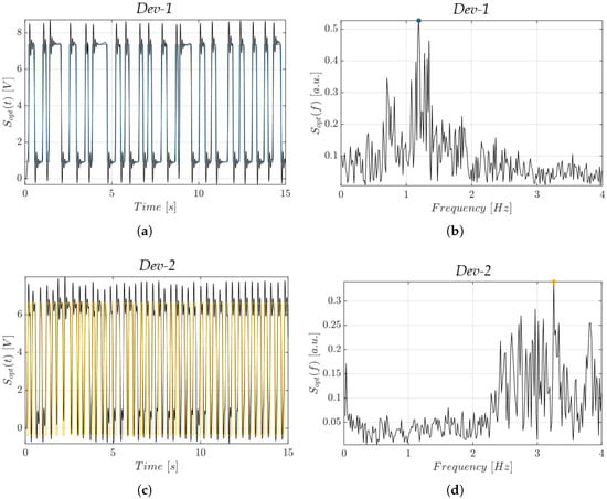 Acquired optical signals in the time domain () and in the frequency domain () at P = 1 mW and = 0.2 mL/min: (a,b) Dev-1 (light blue) and (c,d) Dev-2 (yellow).