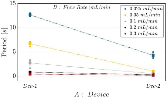 The same conclusions can be drawn by considering the effects diagram for the investigated mean period T reported in Figure 11. The plot confirms that Dev-2 consistently exhibits shorter slug periods compared to Dev-1 across all tested flow rate values. An additional observation is that Dev-1 demonstrates greater sensitivity to variations in flow rate, as evidenced by the wider spread in the slug period values across the tested conditions. In contrast, Dev-2 shows a more compressed response span, with slug periods changing less distinctly between flow rate values. This improved discriminatory capability of Dev-1 is the result of its smoother and more-uniform microchannel geometry, which enables more consistent flow patterns and minimizes the stochastic effects introduced by surface irregularities. Consequently, changes in the flow rate more directly influence the hydrodynamic behavior of Dev-1, making it more responsive to minor variations in operational parameters. In contrast, the more irregular profile of Dev-2 introduces additional sources of disturbance and local turbulence. These effects hide the impact of incremental changes in the flow rate. Additionally, the slightly narrower average channel width in Dev-2 contributes to an increased flow velocity, promoting frequent slug formation. These findings collectively highlight the effect of microchannel morphology not only in determining slug flow frequency but also in tuning the system’s sensitivity to flow rate modulation. However, the latter strategy, by properly modulating the micrometric deviations of the surface morphology, can be employed at lower flow rate values (i.e., FR ≤ 0.2 mL/min), since Dev-1 and Dev-2 ensure similar hydrodynamic behavior when this threshold value is exceeded (see the black and red lines in Figure 11). This outcome is supported by earlier studies, which showed that more consistent hydrodynamic behavior, specifically regarding the frequency peak, was observed in two-phase flow systems when higher flow rate values were applied [52]. Additionally, it was demonstrated that such hydrodynamic processes exhibited greater periodicity under increased flow rate conditions, reaching up to 1 mL/min [53].