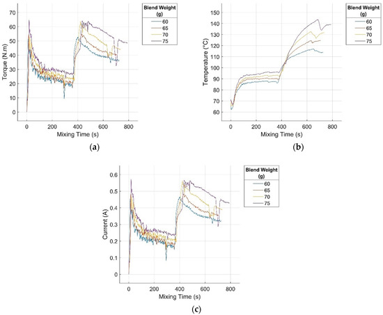 Experimental functional dependencies of (a) torque, (b) blend temperature, and (c) electric current on mixing time for various blend masses in the mixer chamber.
