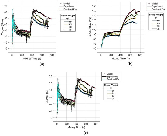 Comparison of experimental mixing curves with GRNN-predicted curves and extrapolated segments for (a) torque, (b) temperature and (c) electric current at varying blend masses.