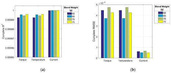 Statistical performance metrics for complete mixing curves: (a) coefficient of determination (R2), and (b) root mean square error (RMSE).
