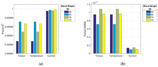 The simulation of the trained GRNN model was conducted using normalized input data from both the full-length curves and partial curve segments. The resulting predicted values of the monitored mixing process parameters were evaluated using standard quantitative metrics to assess the accuracy and reliability [33]. For simulations involving partial segments, only the initial 10% of each curve was employed as input, allowing the model to extrapolate the entire mixing process trajectory from the earliest phase. This approach aimed to evaluate the predictive power of the model and its potential for the early-stage assessment of process quality.