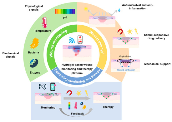 To overcome the limitations of traditional wound care, there is a promising strategy to integrate the diagnosis with the treatment within a hydrogel-based wound dressing [12,13]. However, most of the current research has mainly focused on either the diagnostic or therapeutic functions rather than an integrated wound-care system integrating a diagnosis [14,15] and therapy [16,17]. This disconnection hinders the development of wound-care solutions that can dynamically respond to the wound microenvironment. Thus, there exists a critical need for a comprehensive review to highlight the gaps between the current treatments and the real needs for wound care.