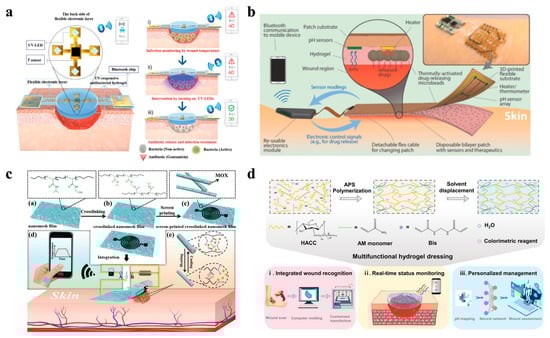 Wearable hydrogel-based wound dressings combining monitoring and therapy functions. (a) A smart flexible electronics-integrated wound dressing, consisting of a polydimethylsiloxane-encapsulated flexible electronic layer and a UV-responsive antibacterial hydrogel [147]. Reproduced/adapted from [147], WILEY, 2020. (b) An automated smart bandage comprising an array of flexible pH sensors and a flexible heater to trigger thermo-responsive drug carriers containing antibiotics [148]. Reproduced/adapted with permission from [148], WILEY, 2018. (c) A flexible and breathable on-skin electronic device featuring temperature-sensing capabilities and temperature-sensitive, on-demand drug release [149]. Reproduced/adapted with permission from [149], WILEY, 2021. (d) A multifunctional hydrogel as a wound dressing for intelligent wound monitoring, including wound recognition, real-time status monitoring, and personalized wound management [150]. Reproduced/adapted with permission from [150], ELSEVIER, 2022.