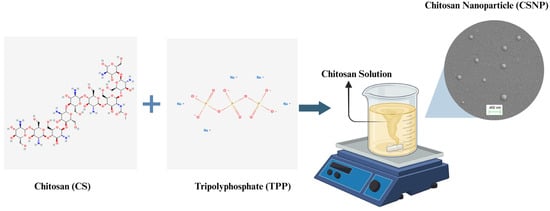 In the initial stage of the study, solutions containing varying concentrations of CS and sodium TPP were prepared to optimize the nanoparticle formulation. The optimization process aimed to identify the optimal parameters for CSNP production by evaluating different CS:TPP ratios and process conditions. The parameters utilized for CSNP production are summarized in Table 1, providing a comprehensive overview of the experimental design. To facilitate a better understanding of the CSNP production process, a schematic representation is provided in Figure 1, illustrating the key steps involved in the preparation of chitosan nanoparticles via the ionic gelation method.
