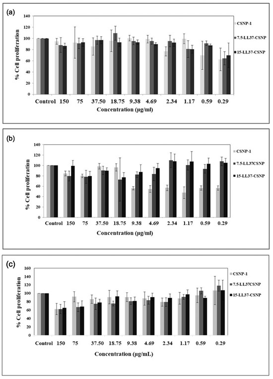 Effects of CSNP formulations on cell proliferations: (a) CSNP-1, 7.5-LL37-CSNP, and 15-LL37-CSNP at 24 h; (b) CSNP-1, 7.5-LL37-CSNP, and 15-LL37-CSNP at 48 h; and (c) CSNP-1, 7.5-LL37-CSNP, and 15-LL37-CSNP at 72 h.
