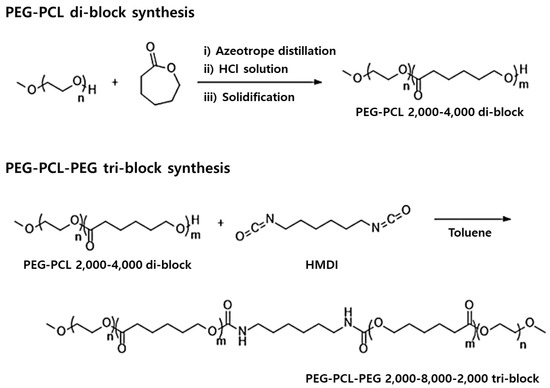 For the synthesis of the PEG-PCL-PEG tri-block copolymers, 900 g of the purified PEG-PCL copolymer was redissolved in 3 L of toluene in the same reactor. Then, 12 g of hexamethylene diisocyanate (HMDI) was subsequently added, and the reaction was stirred at 180 rpm for 24 h. To minimize undesirable side reactions such as the crosslinking or hydrolysis of isocyanate groups, the reaction was conducted in toluene under a dry nitrogen atmosphere, which helped to limit moisture interference during urethane bond formation. After completion, the mixture was condensed, and 1.5 L of dichloromethane was added while maintaining stirring. The solution was then precipitated dropwise into cold ether (0 °C) under agitation. The final product was isolated by filtration and dried under vacuum for 48 h to yield the PEG-PCL-PEG copolymers. The reaction mechanism is illustrated in Figure 1, where two equivalents of PEG-PCL-OH react with HMDI to yield the symmetric PEG-PCL-PEG copolymer. The tri-block copolymer was synthesized by urethane linkage formation, wherein the terminal hydroxyl groups of PEG-PCL react with the electrophilic isocyanate groups of HMDI to form covalent -NH-COO- bonds. This step-growth reaction enables the formation of the symmetric PEG-PCL-PEG copolymer.