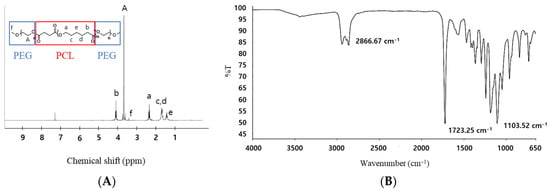 (A) 1H-NMR spectrum of synthesized PEG-PCL-PEG copolymer in CDCl3 (400 MHz), (B) FT-IR spectrum showing characteristic stretching vibrations of CH2 (2866 cm−1), C=O (1723 cm−1), and C-O-C (1103 cm−1) functional groups.