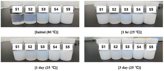 The dispersion stability of PEG-PCL-PEG copolymer samples (S1–S5) in distilled water (10% (w/v)) was evaluated by monitoring visual turbidity from initial dissolution at 80 °C to storage at 25 °C for three days (Figure 3). While all samples were subjected to heating for solubilization, notable differences in turbidity behavior emerged upon cooling and subsequent storage.