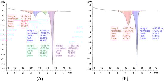 DSC thermograms of PEG-PCL-PEG copolymers formed under different precipitation temperatures: (A) 15 °C and (B) 5 °C. All copolymers were synthesized using identical polymerization and solvent conditions, with only the precipitation temperature being varied. This comparison aims to evaluate the effects of temperature on thermal transitions, including the crystallinity and melting behavior of the copolymers.