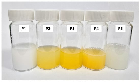 The visual appearances of the prepared formulations are shown in Figure 5, while their corresponding compositional details are provided in Table 3. Each sample was dispersed in distilled water according to its respective composition. Formulation P1, composed solely of PEG-PCL-PEG without additional additives, exhibited a milky and opaque appearance, reflecting the intrinsic turbidity of the polymer matrix. In contrast, formulations P2, P3, and P4, each containing idebenone, displayed a distinct yellow hue, corresponding to the inherent coloration of the antioxidant compound. Slight variations in color intensity and opacity were noted among these samples, influenced by the concentration of idebenone and the addition of sodium hyaluronate in P4. Formulation P5, representing the regeneration-oriented series, showed a semi-translucent, whitish appearance. Compared to P1, its reduced turbidity is likely due to the inclusion of sodium hyaluronate and glycerin, which modulate the refractive index and enhance dispersion uniformity [35,36,37]. These visual observations provide preliminary evidence of the successful additive incorporation and clearly distinguish the antioxidant and regeneration-focused formulations. This differentiation supports the strategic formulation design intended for subsequent biological evaluation.