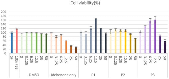 Prior to evaluating antioxidant efficacy, a cell viability assay was conducted to assess the cytocompatibility of idebenone-containing formulations. HaCaT cells were exposed to serial dilutions of free idebenone or PEG–PCL–PEG-based formulations (P1–P3), and cell viability was measured after 24 h using a WST-based assay (Figure 6). Free idebenone induced a dose-dependent reduction in viability, with significant cytotoxicity observed at concentrations above 2.5 µg/mL, where cell viability dropped below 50%. This finding highlights the potential toxicity risks associated with free idebenone at higher doses. In contrast, formulations P1–P3 exhibited markedly improved cytocompatibility across all tested concentrations. At the highest tested concentration (50 µg/mL), P2 and P3 maintained cell viability at approximately 70% and 60%, respectively, whereas free idebenone caused a marked decline in cell viability under the same conditions. This protective effect is likely due to the encapsulation of idebenone within the PEG-PCL-PEG copolymer matrix, which may regulate its release profile and reduce direct cellular exposure [38,39,40,41]. Overall, these findings support the use of PEG-PCL-PEG-based formulations, as they enable safer and more biocompatible delivery of idebenone, providing a promising platform for subsequent functional assessments.