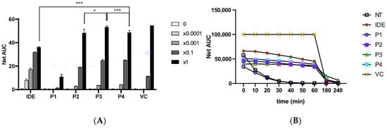 The antioxidant efficacy of idebenone-loaded PEG–PCL–PEG formulations was evaluated using the ORAC assay, with the results summarized in Figure 7. Both the initial radical scavenging capacity and the time-dependent retention of antioxidant activity were assessed through net area under the curve (Net AUC) analysis. As shown in Figure 7A, idebenone-containing formulations (P2–P4) exhibited clear concentration-dependent increases in antioxidant activity, whereas the polymer-only control (P1) showed minimal effects. A slight elevation in Net AUC was observed for P1 at the lowest concentration, likely due to optical interference from sample turbidity rather than true antioxidant action. Among all formulations, P3 consistently achieved the highest Net AUC values across most concentrations, indicating superior free radical scavenging activity attributed to its higher idebenone content (0.1% (w/v)).