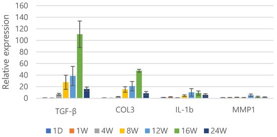 To investigate the regenerative efficacy of the PEG–PCL–PEG formulation, the gene expression profiles of the key genes involved in extracellular matrix remodeling were assessed over a 24-week period post-injection (Figure 8). The analysis focused on TGF-β, COL3, interleukin-1β (IL-1β), and matrix metalloproteinase-1 (MMP1), which are closely linked to collagen synthesis, tissue remodeling, and inflammatory responses. TGF-β expression exhibited a significant increase, peaking at 16 weeks with a notably higher level than the initial baseline. This marked elevation suggests the robust stimulation of fibroblast activation and matrix production during mid-phase remodeling. COL3 expression also increased over time, showing a delayed but coordinated rise that culminated around the same time point as that for TGF-β. The synchronous upregulation of these two markers implies active collagen biosynthesis and sustained tissue regeneration.