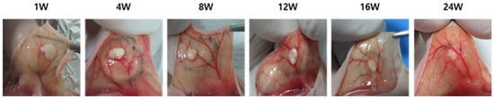 Building upon the gene expression findings, sequential morphological changes and angiogenesis at the injection site were evaluated over a 24-week period (Figure 9). The early upregulation of regenerative markers such as TGF-β and COL3, as identified in the molecular analyses, indicated the activation of extracellular matrix synthesis and tissue remodeling pathways [48,49,50]. These signals correlated well with the macroscopic and histological changes observed during this study.