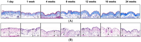 The histological progression of collagen regeneration following the subcutaneous injection of the PEG-PCL-PEG formulation was evaluated using Masson’s trichrome and hematoxylin and eosin (H&E) staining at multiple time points, as shown in Figure 10. In the Masson’s trichrome-stained sections (Figure 10A), collagen fibers appeared blue, allowing for a qualitative assessment of ECM deposition. At 1 day and 1 week post-injection, collagen density was low, characterized by loosely arranged and discontinuous fibers within the dermis. By 4 and 8 weeks, a noticeable increase in collagen fiber density and organization was observed, correlating with the peak expression of regenerative markers such as TGF-β and COL3. At 12 weeks, the dermal matrix exhibited substantial enhancement, with densely packed, well-organized collagen bundles indicative of robust matrix remodeling. This mature collagen architecture persisted through 16 and 24 weeks, suggesting the establishment of a stabilized and long-lasting ECM network.