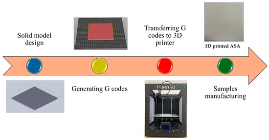 The laser-cutting specimens, each with surface dimensions of 130 × 130 mm2 and thicknesses ranging from 2 mm to 4 mm in 0.5 mm increments, were designed using SolidWorks CAD software (version 2020). G-codes were then converted with PrusaSlicer 2.6.1 and were 3D-printed with a TEIRA3D printer (TEIRA3D, Kocaeli, Türkiye), which works on the principles of FFF technology. The various stages of sample production on the 3D printer are explained in detail in Figure 1.