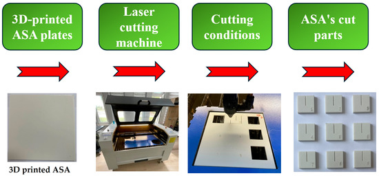 ASA is an outdoor-use thermoplastic with good weathering and ultraviolet (UV) stability; it also exhibits improved mechanical strength and temperature stability over other thermoplastics such as polyvinyl chloride (PVC), polycarbonate (PC), polypropylene (PP), and polyethylene (PE) [5]. Its resistance to the outdoor environment makes it perfect for outdoor applications, automotive parts, and technical housing [6]. Using ASA with the FFF process allows for the manufacture of parts that need mechanical strength and good finishes. On the other hand, FFF processes have some apparent drawbacks, including limited dimensional accuracy, interlayer adhesion problems, and surface roughness-related issues caused by the layer-wise deposition process [7]. Hence, post-processing measures are required to improve the printed components’ functional and aesthetic attributes. Among many methods, laser cutting is gaining prominence as a precise and reasonably fast process for correcting geometry, improving surface finishes, and customizing components [8].