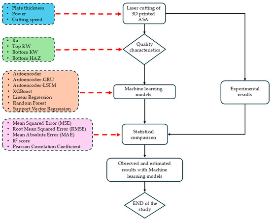 These combined approaches form what are called Multi-Evaluation Methods (MEMs) and, thus, present a very robust framework for conducting a stable and thorough assessment. Unlike single-metric evaluations, MEMs allow one to establish a multidimensional understanding of the model’s behavior and effectiveness. The most important contribution they make to literature is to provide a common, multidimensional evaluation platform for all the models, whether hybrid DL or traditional, in complex situations, such as the laser cutting prediction case. This approach provides a more detailed and objective comparison, aiding superior model selection and process optimization, quantitatively. Model performance was assessed using the standard error metrics Mean Squared Error (MSE), RMSE, Mean Absolute Error (MAE), Coefficient of Determination (R2), and Pearson’s correlation coefficients. These were calculated for the test dataset, and an analysis of the comparative results was then conducted to designate the models that were most accurate and had greater generalization ability. This study proposes a variant of hybrid models, such as AE-GRU and AE-LSTM, which are rarely used in experimental manufacturing research, to predict laser cutting performance; this is considered a novel approach. Further, DL methods are compared with the traditional ones and offer a predictive methodology suitable for multi-output optimization in CO2 laser cutting processes. Figure 4 presents the flowchart for the ML workflow.