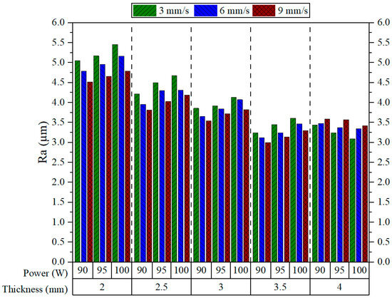 Figure 5 shows the average Ra values measured for different combinations of cutting parameters. Each group of bars represents a specific material thickness and shows the effects of the power–speed combinations. Generally, an increase in material thickness decreases Ra. However, this trend is broken when the thickness increases from 3.5 to 4 mm, where there is a sudden increase in Ra; other than this, Ra decreases with increasing cutting speed, except at 4 mm thickness, where the opposite happens. Similar results were obtained by Kechagias et al., who reported a reduction in Ra values with increased cutting speed [7]. Similarly, increasing the laser power generally leads to a rise in Ra across all thicknesses, except at 4 mm, where higher power results in a decrease in Ra, exhibiting an opposite pattern to that seen with cutting speed. The same study by Kechagias et al. also revealed that Ra increases with increasing power [7]. With the thinnest plates (2 mm), Ra values are generally high and exceed 5.0 µm.