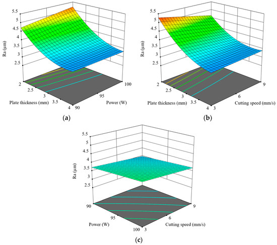 The 3D response surface plots illustrate the combined effects of the process parameters on Ra (Figure 6). Figure 6a, which shows the interaction between plate thickness and laser power, shows a clear decreasing trend in Ra as both thickness and power increase, up to 4 mm. Thin plates processed at lower power levels tend to yield lower Ra values compared to those cut at higher powers. This indicates that an adequate amount of laser energy is crucial to ensure proper melting and effective ejection of material, especially for thicker sections. Figure 6b, which maps the relationship between plate thickness and cutting speed, reveals a similar pattern. Higher cutting speeds substantially reduce Ra, although this trend is again disrupted at 4 mm thickness. This phenomenon can be attributed to the shorter interaction time between the laser beam and the material surface at higher speeds, which restricts heat buildup and reduces surface damage. The obtained result is consistent with the findings reported by Moradi [39]. The smoothest regions are observed at the highest speed and moderate-to-high thickness combinations.