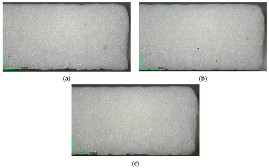 Surface images of specimens cut at varying speeds: (a) 3 mm/s, (b) 6 mm/s, (c) 9 mm/s.