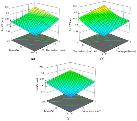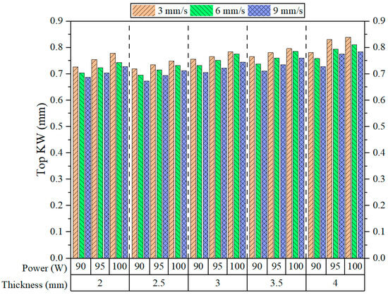 Figure 8 presents the experimental Top KW results, revealing consistent trends across different levels of power, speed, and thickness. Overall, it can be observed that Top KW generally declines as speed increases, independent of the applied power or thickness. This observation corroborates Sabri et al.’s findings [14]. This phenomenon is attributed to the reduced interaction time between the laser beam and the polymer surface at high cutting speeds. As a result, lateral heat diffusion and melting beyond the immediate cutting line are minimized. For all examined thickness levels, the highest Top KW values consistently occur at the lowest speed of 3 mm/s. In contrast, lower values are typically observed when the speed increases to 9 mm/s. This behavior becomes more evident with increasing material thickness, implying a stronger effect of cutting speed on KW as material volume increases. For instance, looking at 4 mm thickness, the difference in Top KW between the cutting speeds of 3 and 9 mm/s appears far greater than for a thinner plate.