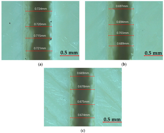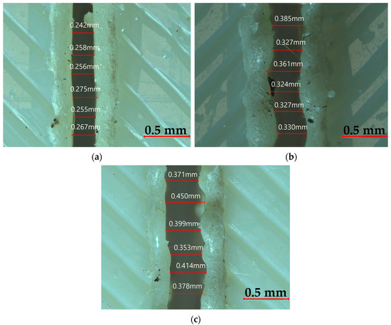 Figure 9 illustrates the combined influence of power, speed, and thickness on the Top KW. In Figure 9a, Top KW increases gradually with an increase in thickness and power, especially at 4 mm and 100 W, owing to the higher energy input and consequent thermal accumulation. As the cutting speed increases in Figure 9b, there is a marked reduction in Top KW, especially at higher thickness values, due to shorter interaction times limiting heat diffusion. A relatively minor interaction between power and speed is observed in Figure 9c, indicating that their effect on Top KW is not particularly significant when thickness is held constant. Low power and high speed, however, consistently yield the minimum Top KW. Of the three parameters, plate thickness plays the most consequential role. It can be concluded that the Top KW can be minimized when subjected to lower power, higher cutting speed, and intermediate material thickness. The surface plots concur with experimental data, emphasizing the thermal dynamics controlling kerf formation. Figure 10 shows microscopic images of the Top KW for 2.5 mm thick ASA plates cut at 90 W. An increase in speed from 3 mm/s to 9 mm/s results in a noticeable decrease in KW, indicating that higher cutting speeds enhance dimensional accuracy.