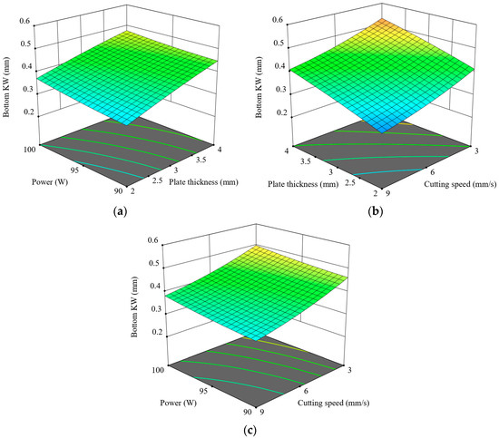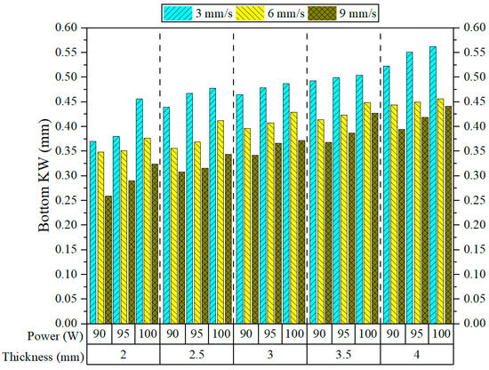 The impact of laser cutting parameters on Bottom KW is depicted in Figure 12. Figure 12a shows Bottom KW rising with greater thickness and power, as thicker materials and higher power levels produce wider kerf formations at the bottom due to excessive heat accumulation. As shown in Figure 12b, Bottom KW increases with thickness and lower speeds, implying longer interaction times between laser and material, resulting in deeper thermal penetration and wider bottom kerfs. Figure 12c exhibits a more influential effect of cutting speed compared to power, considering that Bottom KW reduces notably with rising speed, particularly at lower power. This is because the latter restricts the time for heat diffusion and the melting depth due to limited interaction time at high speeds. Notably, the lowest Bottom KW is always achieved at the combination of the lowest power and the fastest cutting speed (90 W–9 mm/s). In contrast, the largest KW is observed at 100 W and 3 mm/s, particularly for thick plates. In summary, plate thickness is the variable with the greatest effect, followed by cutting speed and then laser power, which has a moderate effect on Bottom KW. Figure 13 illustrates the changes in Bottom KW under constant conditions of 9 mm/s speed and 90 W power. As the thickness increases, Bottom KW also increases, with the narrowest kerf observed at 2 mm and the widest at 4 mm, likely due to deeper heat penetration and increased material melting.