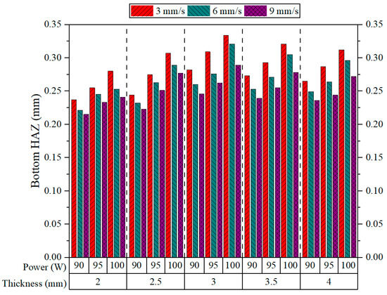 Figure 14 depicts the Bottom HAZ variation among different plate thicknesses at various laser powers and cutting speeds operating under CO2 laser cutting. There seems to be a general trend wherein Bottom HAZ increases with decreasing cutting speed, irrespective of thickness or power. This trend was also observed by Sabri et al., who found that an increase in cutting speed results in a reduction in the HAZ [14]. This type of behavior is attributed to the longer interaction time of the laser beam with the material at a lower speed, which allows for more thermal penetration and heat accumulation in the bottom region of the cut. The highest Bottom HAZ values are always noted at 3 mm/s across all speed levels, while the lowest values are often observed at 9 mm/s. The theory that faster cutting speeds reduces the depth of thermal diffusion is also supported by these observations. At 3 mm thickness and 100 W power, for example, Bottom HAZ exceeds 0.33 mm at 3 mm/s and drops to less than 0.27 mm at 9 mm/s. This is a strong endorsement for the importance of interaction time in dictating the amount of thermal damage to the bottom regions of the material.