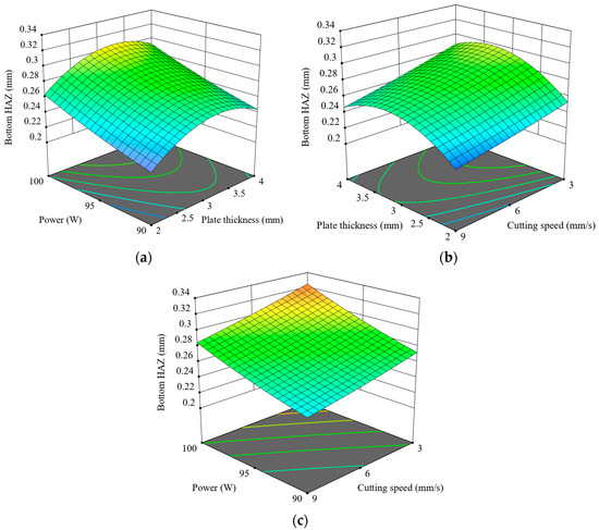 Figure 15 presents the interactions between the cutting parameters and Bottom HAZs during CO2 laser cutting. In Figure 15a, Bottom HAZ widens as the power and thickness increase, peaking between about 95 and 100 W and a thickness of 3 to 3.5 mm, suggesting maximum thermal accumulation under these conditions. Figure 15b displays the same trend: the Bottom HAZ increases with thickness and decreases with speed, thereby emphasizing long interaction time for heat diffusion. However, the thickest plates at the slowest speed (3 mm/s) result in the greatest HAZ depth. Figure 15c confirms that when the power is high and the speed is low, the Bottom HAZ increases to a maximum, supporting the mechanism where high energy input combined with prolonged exposure leads to significant thermal damage.