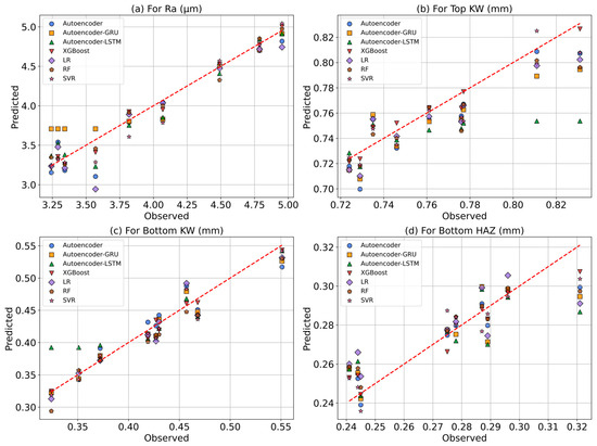 Figure 17 compares the predicted values obtained from seven different ML models with the actual observed values for each response. The red dashed line represents the ideal equality line (y = x), offering a visual means to evaluate the accuracy of model predictions. Among the ML models developed for predicting Ra, XGBoost, RF, and Autoencoder models show particularly high agreement with the observed values and cluster closely around the equality line. These models have successfully captured the complex relationships between the laser cutting parameters affecting Ra. However, some deviations are observed in the Autoencoder–GRU and LR models, which may indicate insufficient learning performance. For Top KW, greater deviations in prediction performance are seen compared to Ra, especially in the Autoencoder–LSTM model. Noticeable discrepancies from the observed values are evident in both the Autoencoder–LSTM and Autoencoder–GRU models. Nonetheless, the XGBoost, RF, and SVR models produced relatively accurate results.