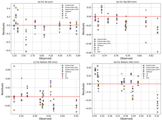 Residual analyses of observed and predicted values for each response metric are illustrated in Figure 18. In the prediction of Ra, the XGBoost and RF models demonstrated high consistency, as indicated by the balanced distribution of residuals around zero. In contrast, the Autoencoder–GRU model exhibited the highest positive deviation above the zero line, while the LR model showed the most significant negative deviation below it. For the prediction of Top KW, the XGBoost model, followed by the RF model, achieved the lowest errors and the highest coefficients of determination. Conversely, the Autoencoder–LSTM model produced greater uncertainty in predictions, as reflected by its wider range of deviations. In the prediction of Bottom KW, the XGBoost model yielded predictions closest to the zero line, characterized by the lowest residuals and the highest goodness of fit. The Autoencoder–LSTM model, on the other hand, displayed a more dispersed residual pattern, especially in the positive direction, resulting in lower accuracy compared to other models. Regarding Bottom HAZ prediction, the XGBoost and RF models again stood out, with the lowest prediction errors and the most balanced residual distribution around zero. In contrast, the LR model exhibited broader and more systematic deviations, indicating poor predictive performance. Overall, the residual analyses highlight that the XGBoost model consistently produced narrowly and symmetrically distributed residuals around zero, demonstrating the most stable and reliable predictive performance. In comparison, the Autoencoder–GRU for Ra, the Autoencoder–LSTM for Top KW and Bottom KW, and the LR model for Bottom HAZ showed systematic deviations and broader residual distributions, indicating a lack of capability in capturing complex, nonlinear relationships.