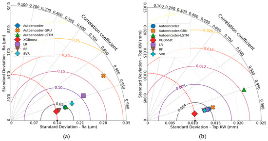 Figure 19 shows the Taylor diagram of the responses. The comparative analysis shown in the figures provides a multidimensional representation of the prediction accuracy of seven ML models used for the responses of FFF-manufactured ASA parts cut by the CO2 laser. When examining the Taylor diagram for Ra, the XGBoost model outperformed the others, exhibiting both a high correlation coefficient and a low standard deviation (r = 0.9804, σ = 0.1408). The RF (r = 0.9778, σ = 0.1495) and Autoencoder (r = 0.9715, σ = 0.1693) models also delivered similarly consistent results. In contrast, the Autoencoder–GRU model was identified as the least successful due to its low correlation coefficient and high standard deviation (r = 0.8995, σ = 0.3120). The remaining models demonstrated moderate accuracy and consistency. For Top KW prediction, XGBoost again delivered the best performance (r = 0.9889, σ = 0.0105). This result is consistent with the findings of the study conducted by Basar [51]. The RF, SVR, and LR models also performed well, clustering close to XGBoost. Although Autoencoder and Autoencoder–GRU showed slightly lower performance, their results were still competitive. On the other hand, the Autoencoder–LSTM model (r = 0.9513, σ = 0.0223) was the least successful, with a lower correlation coefficient and higher standard deviation. Regarding Bottom KW, the best performance was achieved by the XGBoost model (r = 0.9706, σ = 0.0188), followed closely by SVR (r = 0.9649, σ = 0.0205) and LR (r = 0.9633, σ = 0.0209). While Autoencoder–GRU and Autoencoder produced competitive results, they were slightly less successful. Autoencoder–LSTM had the lowest correlation coefficient and the highest standard deviation, indicating the poorest prediction performance (r = 0.9476, σ = 0.0248). In the prediction of Bottom HAZ, XGBoost (r = 0.9670, σ = 0.0109) and RF (r = 0.9654, σ = 0.0112) were the most successful models. Notably, the LR model (r = 0.9327, σ = 0.0152) displayed a lower correlation coefficient and higher standard deviation. Overall, XGBoost was the most successful model across all responses. However, the least successful models varied depending on the response: Autoencoder–GRU for Ra, Autoencoder–LSTM for both Top KW and Bottom KW, and LR for Bottom HAZ.