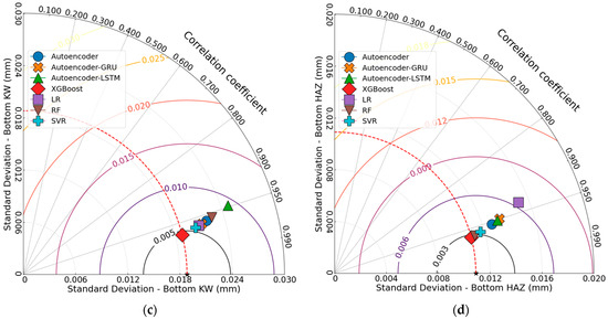 Taylor diagrams: (a) Ra, (b) Top KW, (c) Bottom KW, (d) Bottom HAZ.