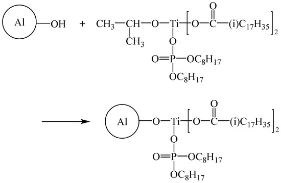 Titanate coupling agent (20 g) dispersed in anhydrous alcohol (100 mL) to obtain the titanate coupling agent-dispersed alcohol solution. Al powder (30 g) was added into the solution, and the mixture was mixed for 1 h using stirrer and ultrasonic treated for 1 h. The mixture was vacuum-filtered at 35 °C for 3 h, washed with deionized water several times, and dried at 60 °C for 3 h to produce the titanate coupling agent-modified Al nanoparticles. A schematic illustration of surface modification of Al powder using the titanate coupling agent is shown in Figure 3. After the surface modification, organic alkyl groups on the Al surface interact with the epoxy matrix, enhancing the compatibility of the filler with the matrix. For convenience, the titanate coupling agent-modified Al is labeled as Ti@Al in this paper.