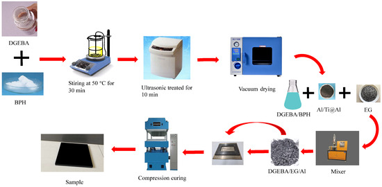 The preparation of the DGEBA/EG/Al and DGEBA/EG/Ti@Al composites is schematically shown in Figure 4. The EG content was 60 wt%, and the Al/Ti@Al content was varied from 0 to 10 wt%. The amount of BPH was 1 phr (parts per hundreds of epoxy resin). The DGEBA, EG, Al/Ti@Al, and BPH were added to a mixer and mixed at 80 °C for 30 min. Then, the mixture was added to a mold, which is preheated and sprayed with a mold release agent. The epoxy composites were polymerized at temperatures of 120, 160, and 190 °C and a pressure of 5 MPa for 1 h.