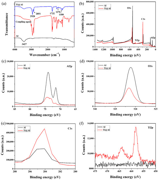 (a) FTIR spectra of Al and Ti@Al. (b–f) XPS spectra of Al and Ti@Al: (b) survey, (c) high-resolution Al2p, (d) high-resolution O1s, (e) high-resolution C1s, (f) high-resolution Ti2p.