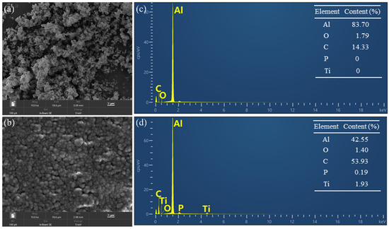 (a,b) SEM images of (a) Al and (b) Ti@Al (magnification of 150,000). (c,d) EDX maps of (a) Al and (b) Ti@Al.