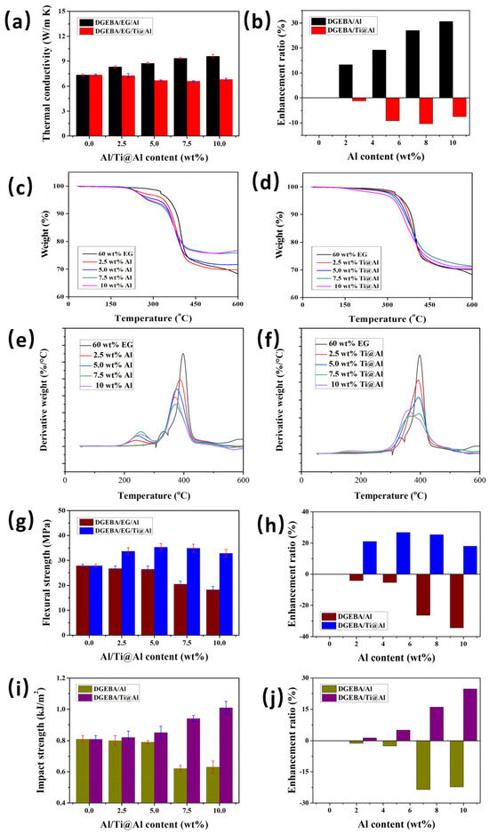(a,b) (a) Thermal conductivity and (b) thermal conductivity enhancement ratio of DGEBA/EG/Al and DGEBA/EG/Ti@Al composites as a function of Al/Ti@Al content. (c,d) TGA thermograms of (c) DGEBA/EG/Al and (d) DGEBA/EG/Ti@Al composites as a function of Al/Ti@Al content. (e,f) DTA thermograms of (e) DGEBA/EG/Al and (f) DGEBA/EG/Ti@Al composites as a function of Al/Ti@Al content. (g,h) (g) Flexural strength and (h) flexural strength enhancement ratio of DGEBA/EG/Al and DGEBA/EG/Ti@Al composites as a function of Al/Ti@Al content. (i,j) (i) Impact strength and (j) impact strength enhancement ratio of DGEBA/EG/Al and DGEBA/EG/Ti@Al composites as a function of Al/Ti@Al content.
