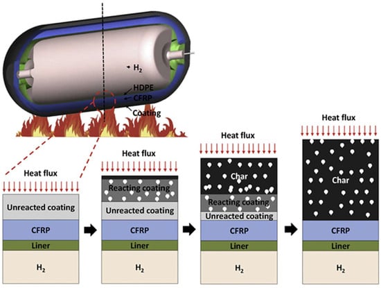 Schematic showing the thermal response of ICs applied to a hydrogen storage tank exposed to fire, illustrating the physical evolution from unreacted coating to expanded charred layer. This process highlights how intumescent coatings serve as a thermal barrier to protect the composite structure and internal hydrogen from extreme heat. Adapted with permission from [11].