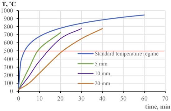 ICs are critical passive fire protection (PFP) systems that form an insulating expanded char layer, reducing heat transfer and delaying structural failure [22,23]. Compared with conventional fireproofing methods, IC offers superior thermal insulation while improving operational efficiency by reducing application time by up to 30% [26]. The oil and gas industry consumes over 40% of IC products due to increased awareness [27]. However, their performance can be influenced by coating thickness, environmental exposure, and fire conditions, necessitating complementary FPSs to enhance durability and stability in oil and gas applications [28]. Critical structures in the oil and gas industry are mainly steel frames, equipment, and lives that need to be protected when exposed to extreme temperature conditions. As illustrated in Figure 2, the temperature evolution of steel structures with varying IC thicknesses under a standard fire regime demonstrates the effectiveness of these coatings. Thicker coatings provide enhanced thermal insulation, with a 20 mm coating significantly delaying heat transfer. In contrast, thinner coatings result in a more rapid temperature increase. Unprotected steel can reach nearly 900 °C within 60 min, posing a significant risk of severe structural failure. In contrast, a 20 mm IC preserves structural integrity for approximately 40 min, underscoring the critical role of ICs in improving fire resistance for oil and gas infrastructure.