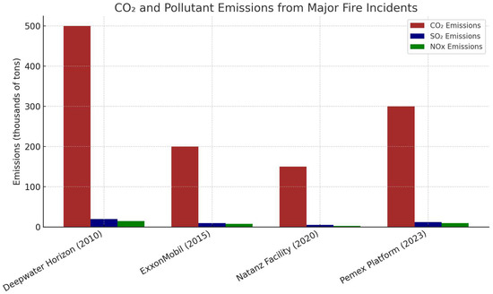Figure 3 shows the carbon dioxide (CO2), sulfur dioxide (SO2), and nitrogen oxides (NOx) emissions from significant fire incidents in the oil and gas industry, highlighting their environmental impact. The Deepwater Horizon [42] disaster resulted in the highest CO2 emissions, demonstrating the severe consequences of offshore oil spills. The ExxonMobil [43] and Pemex Platform [44] incidents also led to significant air pollution. Although the SO2 and NOx emissions were lower, they still contributed to the formation of acid rain and posed respiratory health risks. Although the Natanz Facility [45] incident generated lower emissions, it posed a considerable environmental threat. Table 1 summarizes three gases that are predominantly monitored and identified in fire incidents and their typical exposure details.