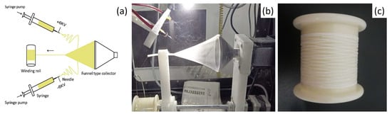 - Wang, W.; Cheng, Y.; Estroff, B. Electrostatic Self-Assembly of Composite Nanofiber Yarn. Polymers 2021, 13, 12. [Google Scholar] [CrossRef] [PubMed]