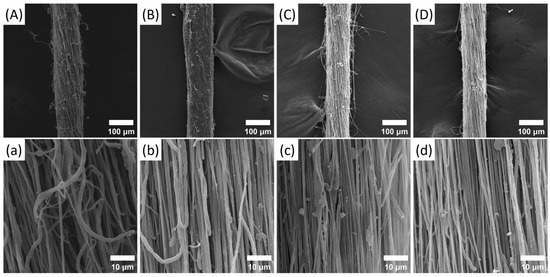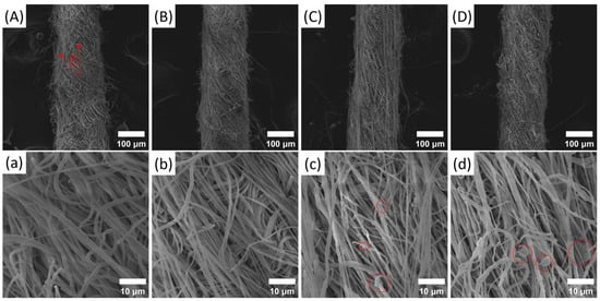 As shown in Figure 2A–D, all NFYs consist of a large number of fine nanofibers and exhibit a bundled yarn structure with slight surface hairiness, which results from nanofibers being deposited preferentially in the triangular region of the funnel-type collector during conjugated electrospinning. The overall appearance of the NFYs remains consistent across different BN concentrations [27]. Based on the average of all samples, the NFY diameter is approximately 172 μm. However, as shown in Figure 3a, the 1% BN sample exhibits a notably smaller diameter (~166 μm), while the 0%, 3%, and 6% BN samples are closer to the mean value. In terms of fiber morphology, the nanofibers in the 0% and 1% BN samples shown in Figure 2a,b are smooth and uniform, whereas those in the 3% and 6% BN samples shown in Figure 2c,d become rougher and more irregular due to the likely agglomeration or uneven distribution of BN fillers, which may weaken the cohesion between nanofibers. This phenomenon was also observed by Zhang and was called the hot string formed by the modified BN (m-BN) decorated fibrous film surface [28]. In addition, the average diameter of inner fibers showed a decreasing trend from 895 ± 57 nm (0% BN) to 711 ± 70 nm (3% BN), followed by a slight increase to 735 ± 74 nm (6% BN), as shown in Figure 3a.