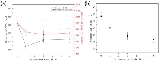 (a) Average diameters of PVDF/BN NFYs and inner nanofibers; and (b) orientation angle of nanofibers along NFYs axis at different BN concentrations.