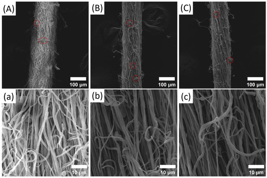 Figure 5A–C, a–c present the SEM images of 1% PVDF/BN NFYs and corresponding inner nanofibers at different stretching temperatures, respectively. It is evident that all NFYs like bundles are composited of densely aggregated nanofibers aligned along the yarn axis, showing improved orientation. At the surface of the NFYs, a small number of disordered nanofibers with bead-like defects were observed (highlighted in Figure 5), especially under higher temperature conditions. The appearance and evenness of NFYs seems not to be affected by hot stretching, but the average diameter of 1% PVDF/BN NFYs gradually decreases from 148.6 ± 1.9 μm at 60 °C to 112.9 ± 2.1 μm at 140 °C according to Figure 6a, indicating that the molecular chains are more likely to be oriented under the thermal motion of the polymer chain segments at high temperature. For the average diameter (~760 nm) of inner nanofibers at different temperatures, no obvious difference is observed according to Figure 6a.