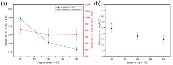 (a) Average diameters of 1% PVDF/BN NFYs; and (b) orientation angle of nanofibers along NFYs axis at different stretching temperatures.