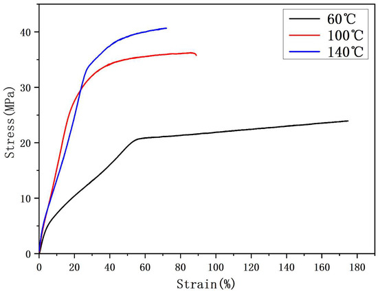 Stress-strain curves of 1% PVDF/BN NFYs at different stretching temperatures.